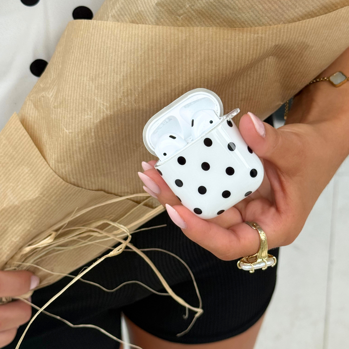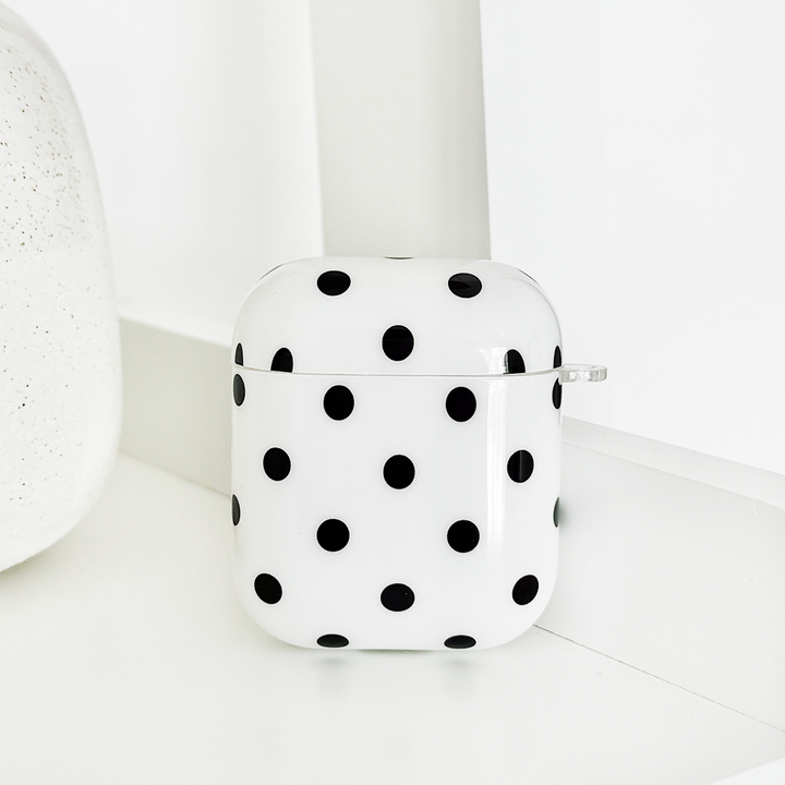 Protect your AirPods in style with this white polka dot case, featuring a sleek monochrome design that’s both sophisticated and trendy. Perfect for the cool girl who wants to keep her tech accessories chic and effortlessly stylish.