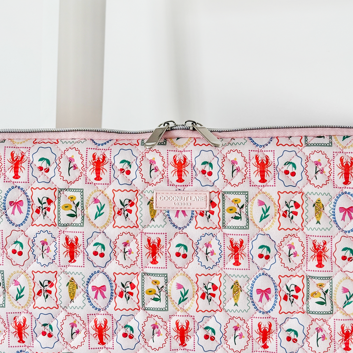 Featuring a vibrant mix of cherries, bows, and lobsters, this colourful design brings a pop of Mediterranean sunshine to your tech. The quilted fabric adds an extra touch of luxury, while the soft padding keeps your laptop snug and safe. It’s the perfect accessory for those who love a dash of fun with their elegance!
