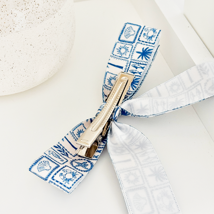 Elevate your hair game with our Malibu Drive Ribbon Bow Clip in crisp blue and white.