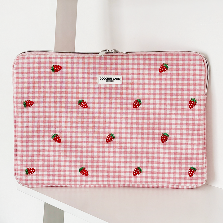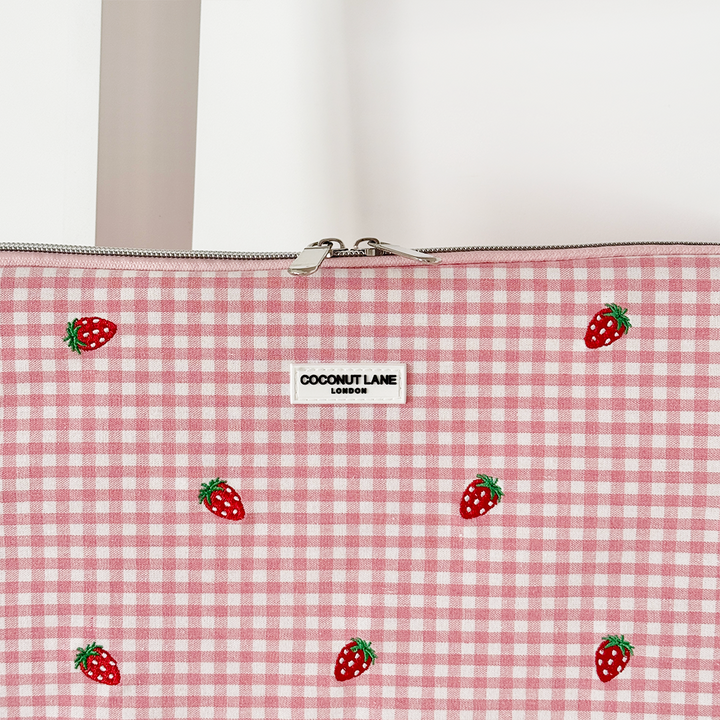 Featuring a soft pink gingham pattern and delicate embroidered strawberries, this sleeve brings all the cosy picnic vibes straight to your tech essentials.